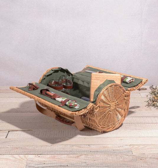 What could be fairer than the Verona Wine & Cheese Picnic Basket? Why, the Verona filled with all your favorite wine, cheese, and charcuterie, of course! This handwoven wicker picnic basket is worthy of your finest sonnet. A classic English-style wine basket, this compact yet roomy willow barrel contains everything you need for wine and cheese picnic for two. Picnic set includes 2 wine glasses, silverware set for 2, wood cutting board, wood-handled cheese knife, a nickel-plated cork bottle stopper, and waiter-style corkscrew. The durable polyester lining and cotton napkins come in matching colorways for vintage-style flair. Grab the canvas carry straps with leatherette details and take this wine picnic basket on your next romantic adventure - or gift it to a favorite couple for weddings, anniversaries, or other special occasions.
