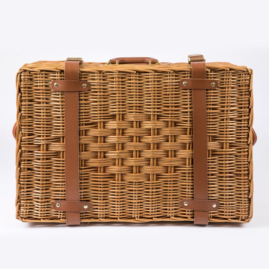 Don't you hate it when a royal drops in, demanding a picnic? For these all-too-frequent occasions, we bring you the Windsor Luxury Picnic Basket for 4, a large, elegant handwoven wicker picnic basket with accessories and service for four. They'll flip for the sizable porcelain plates, white with navy and khaki plaid on the rim. Wow ‘em with the hand-blown, 7-oz. wine glasses filled with your fave cabernet – the one you brought in the Windsor’s wine bag. And what self-respecting royal would turn down a properly served cheese and charcuterie plate – especially prepared right before their eyes from the zipper-top soft cooler bag, presented on the hardwood cutting board with cheese knife? Everything is held securely with the Windsor’s pockets and leatherette straps, leaving plenty of room for snacks and a full meal in the 2 plastic food containers. Be sure to offer everyone a spot of tea with the included coffee/tea service. There’s no better suited wedding gift or anniversary present for your favorite royal couple. For a romantic picnic or a rolicking group outing, you can rely on the Windsor for vintage style and modern quality.