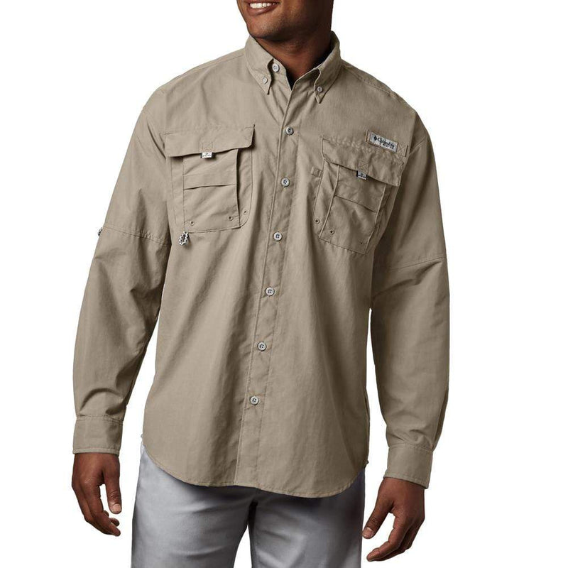 The hard-working Columbia Men's Bahama II Long Sleeve Shirt keeps you comfortable long after you've brought in your limit. Lightweight, durable nylon dries fast should you get splashed; mesh-lined cape vents at the back shoulder enhance airflow to keep you cool in the hottest conditions. Built-in UV protection keeps the sun off your back so you can stay out until you're ready to come in. Two big chest pockets offer plenty of room for small gear; long sleeves can be rolled up and secured with button tabs.