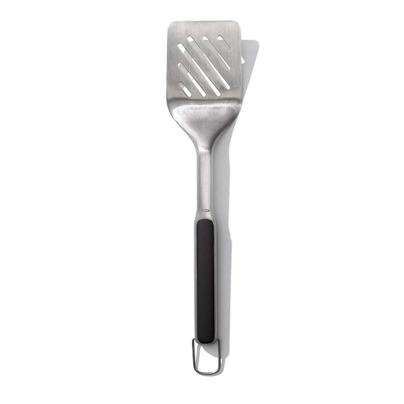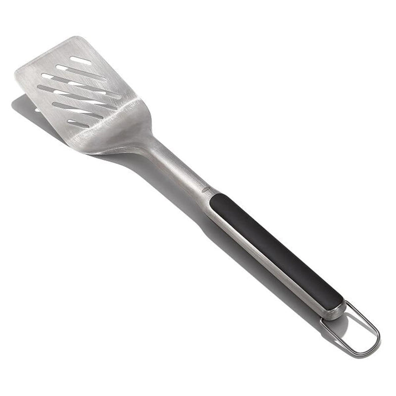 The OXO Outdoor Grilling Turner is the perfect companion for flipping and turning burgers, fish filets, pork chops and other grilling go-to's. The sturdy beveled head glides smoothly under food, while the double-bend design provides leverage for lifting and transferring. With a comfortable, non-slip grip, plus a convenient hanging ring for grill-side storage, you'll reach for this stainless steel spatula every time you step up to the grill. Dishwasher safe.
