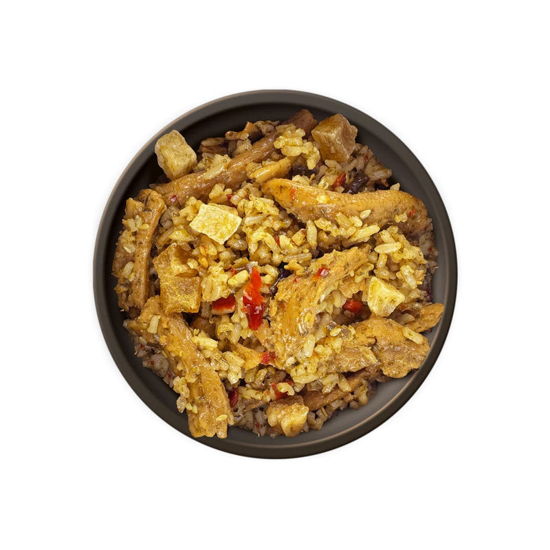 Rice, soy curls (whole soybeans), pineapple chunks (pineapple, sugar, citric acid), sesame seeds*, mct powder (mct oil, gum arabic), bell peppers, tamari powder (soybeans, maltodextrin, salt, sugar), green onion*, apple cider vinegar powder (maltodextrin, apple cider vinegar, modified food starch), salt, garlic powder*, red pepper flakes, ginger*.