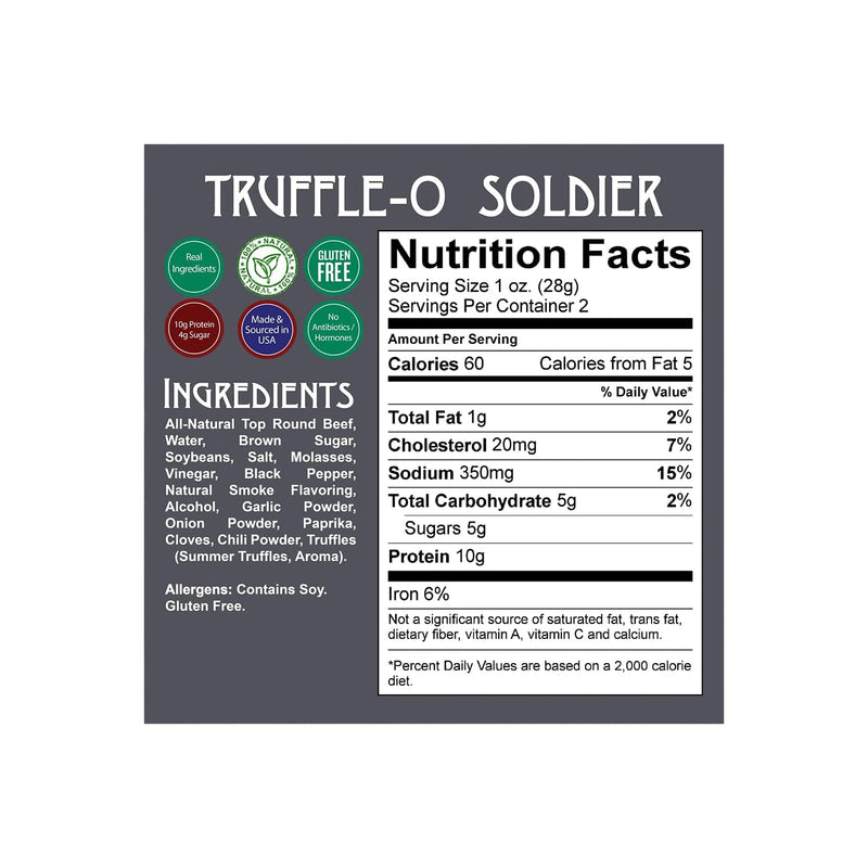 The world's first and only truffle-infused beef jerky, and we don't mean truffle oil or truffle "essence" that's added as an afterthought as the last ingredient just so the name can be in the product title (and inevitably disappoint the customer with weak flavor). No, this jerky is made by adding real black truffle powder, sourced from Italy, into our O.G. Hickory marinade. The resulting delicacy is a smoky, savory, sweet, earthy "UMAMI BOMB" with just the right dose of truffle to delight the senses and set your taste buds' gearshift into overdrive.