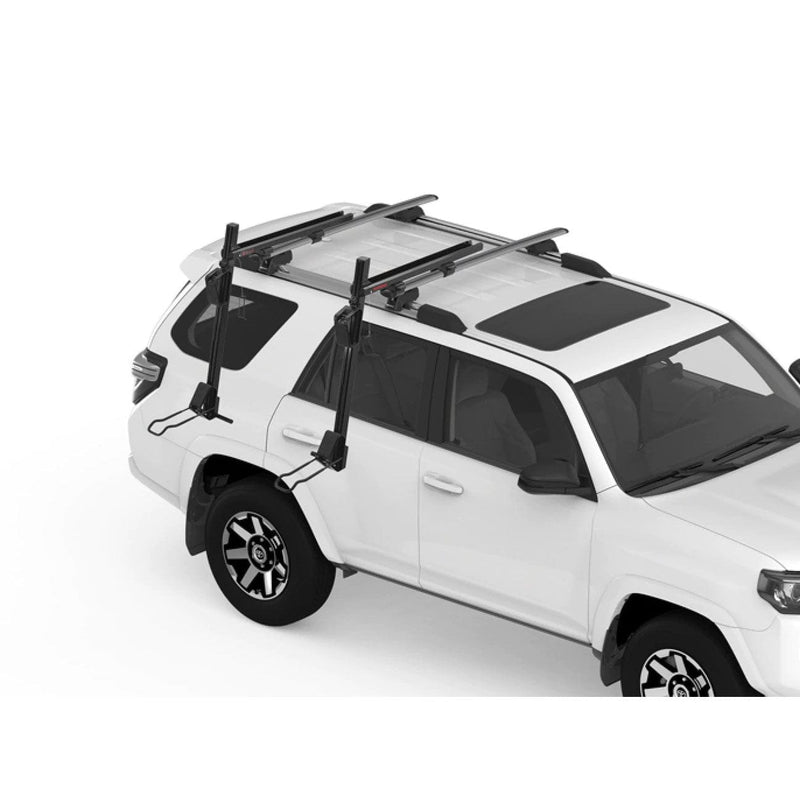 The Yakima ShowDown Kayak/SUP Rack makes loading and unloading heavy boards and boats easy peasy, thanks to the slide and tilt mechanism that takes on up to 45% of the weight.