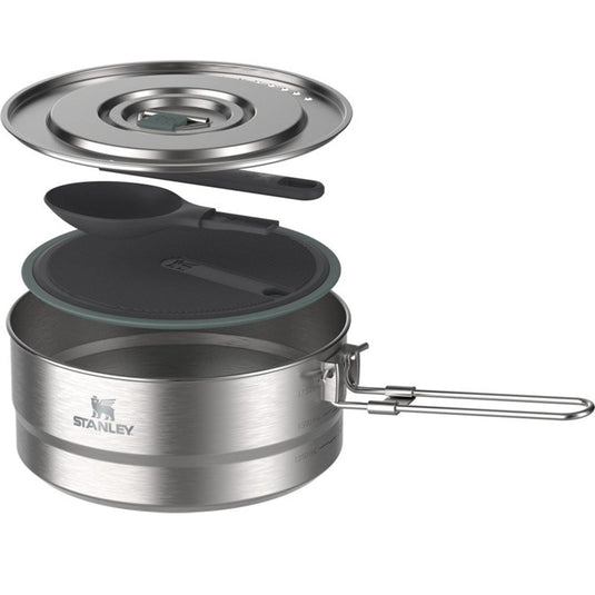 Simple and efficient, the Stanley Wildfare Core 7 in. Saucepan Cookset is made for outdoor hosting. The pieces—saucepan, vented lid, cutting board, trivet and serving spoon—nest for packing ease.