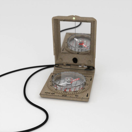 This compass features a mirror that allows you to view the compass dial and the background at the same time. The fact that the compass dial can be seen at the same time the reference point is aligned makes mirror compasses more desirable for taking accurate bearings. A mirror-sighting compass is at its best in open terrain where you must determine direction over long distances.