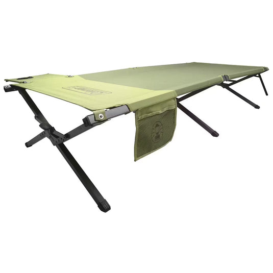 With the Coleman® Trailhead™ Easy-Step Camping Cot, drifting off to sleep in comfort has never been easier. The military-style cot uses an innovative step lock to secure the frame in place, and its rugged steel x-frame's durability is guaranteed for years of use. Keep your water bottle, phone, or reading material on the removable side table with cup holder, and store essentials, such as gloves or a flashlight, in the side pocket.